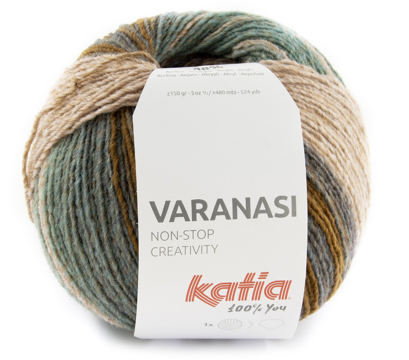 dieses 150-g-Knäuel ist einfach perfekt für wunderschöne Tücher mit Farbeffekt. Entdecke die verschiedenen Multicolor-Effekte, die sich in jedem Knäuel Varanasi verbergen, während du mit Nadelstärke 3,5 ein aufregendes Tuch arbeitest. Die Gratisanleitung dazu findest du im Flyer oder als PDF zum Download auf unserer Website (Katia). Außerdem bieten wir dir eine kostenlose Anleitung für eine Kinderweste.