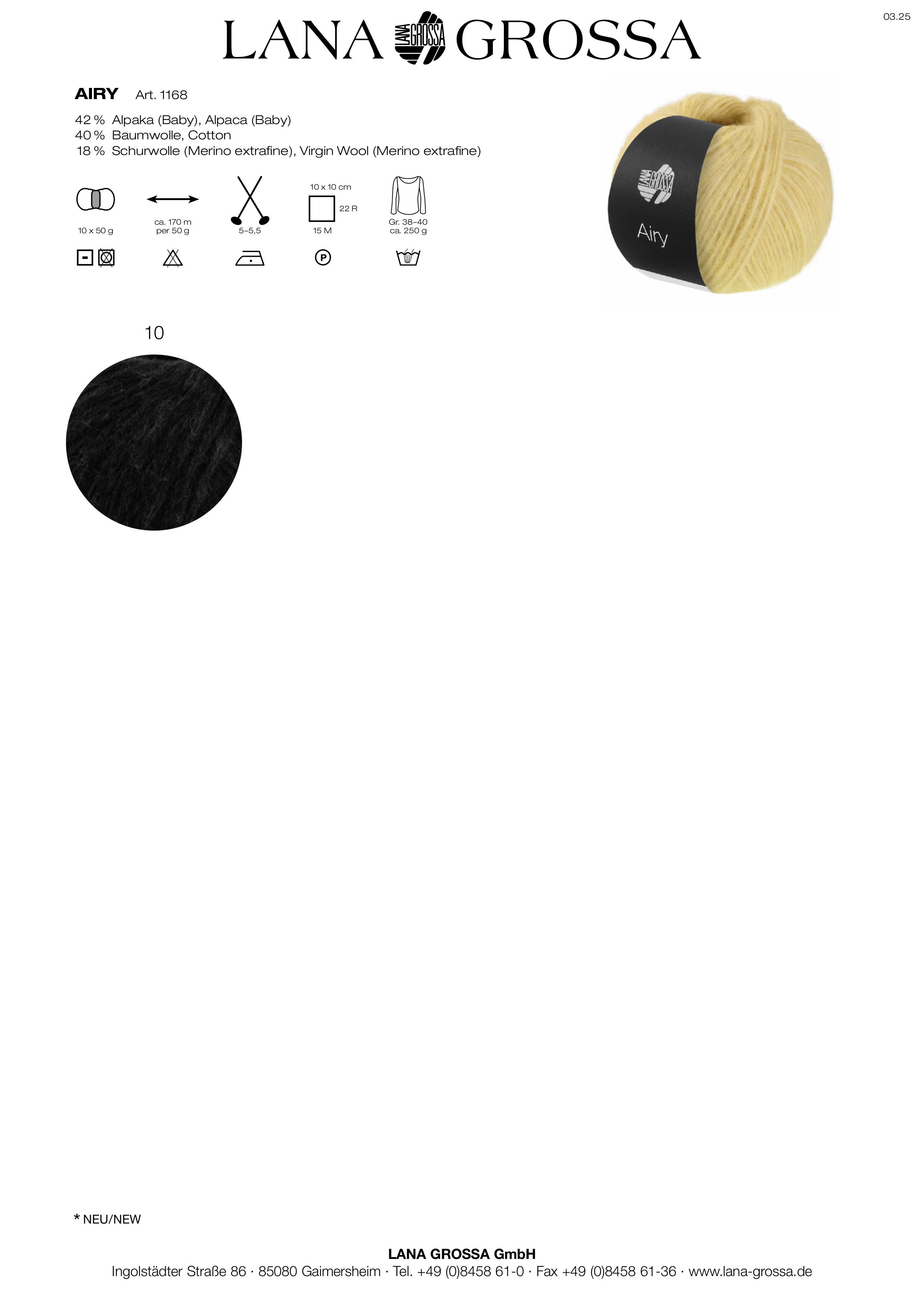 Airy ist ein ultraleichtes, fluffiges Garn mit edlem Charakter – ideal für moderne, voluminöse Strickteile, die dennoch federleicht und luftig bleiben. Die innovative Mischung sorgt für weichen Griff, angenehme Wärme und absoluten Komfort.